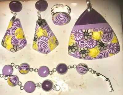 The hardest thing was figuring what cutters to use and if they coordinated of not. I made 4 different canes. The yellow rose was translucent and yellow premo. I thought adding that color made a great contrast. It was fun arranging them on a sheet of well mixed scrap clay. The bracelet was a bit tedious as I had to attach and reattach the jump rings many times so the connectors all faced the same direction